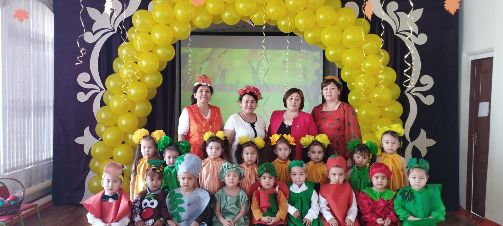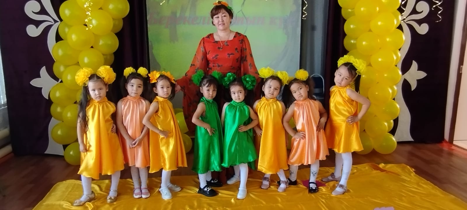 Қуаныштың ағайын,Қоңырауын соғайын.Қуандырып біздерді,Өлкемізге күз келді!1 санаториялық бөбекжай-бақшасыКүзгі табиғатты бейнелейтін əн мен биден шашу шашып, күз мезгілінің ерекшеліктерін айқындайтын өлең шумақтарымен көрермендерді қуантты.
