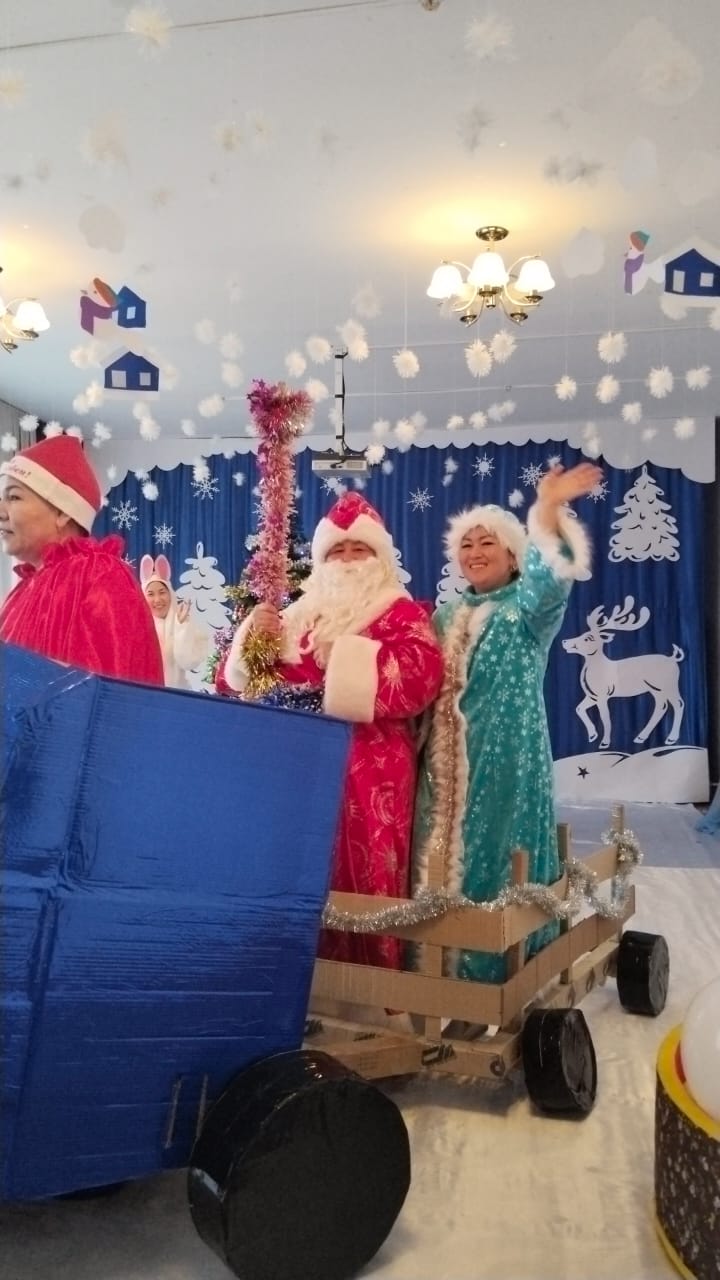 Балалар мульсериалдағыдай синий тракторға мініп келіп Аяз Ата мен Қарша қызды қарсы алып, қызықты ойындар ойнап сыйлықтарып алып қуанышты сезімде болды.