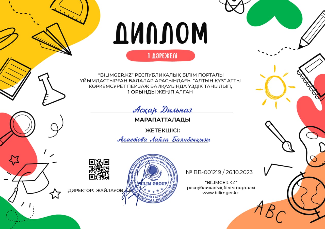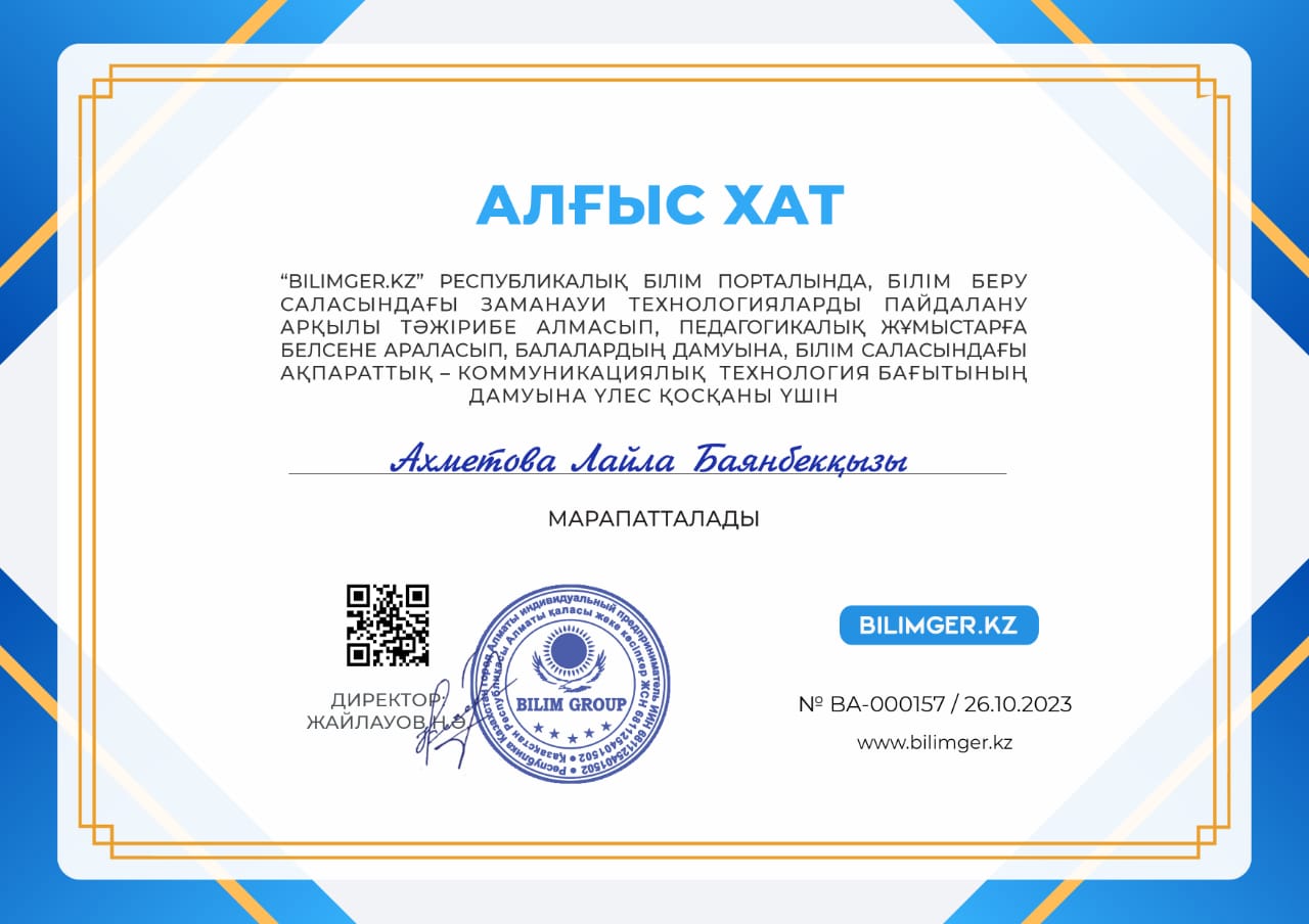 "Bilimger.KZ" республикалық білім порталы ұйымдастырған балалар арасында "Алтын күз"атты көркем сурет пейзаж байқауына қатысып балалары жүлделі Дипломдарға ие болған бөбекжай-бақшамыздың тəрбиешісі Ахметова Лайла Баянбекқызы арнайы Алғыс хатпен марапатталды.